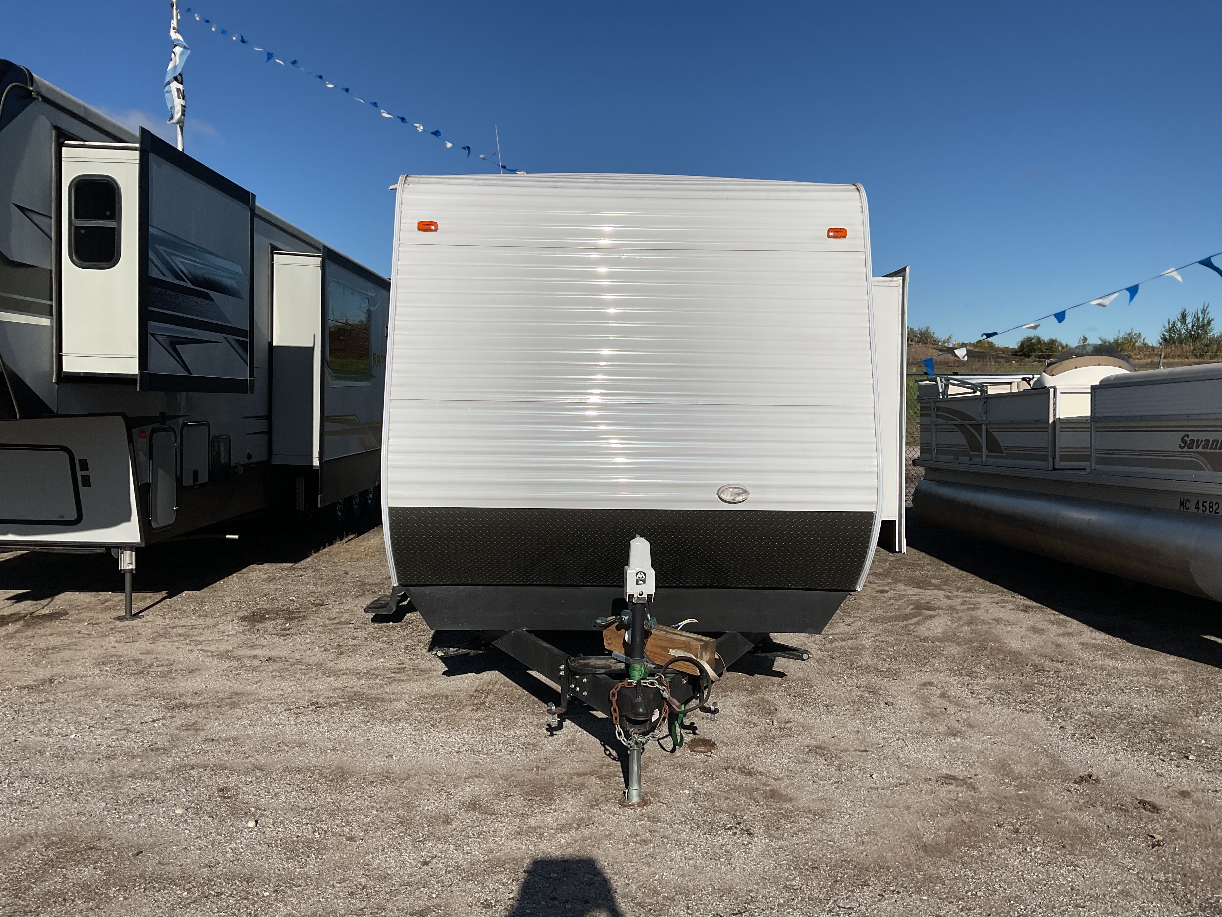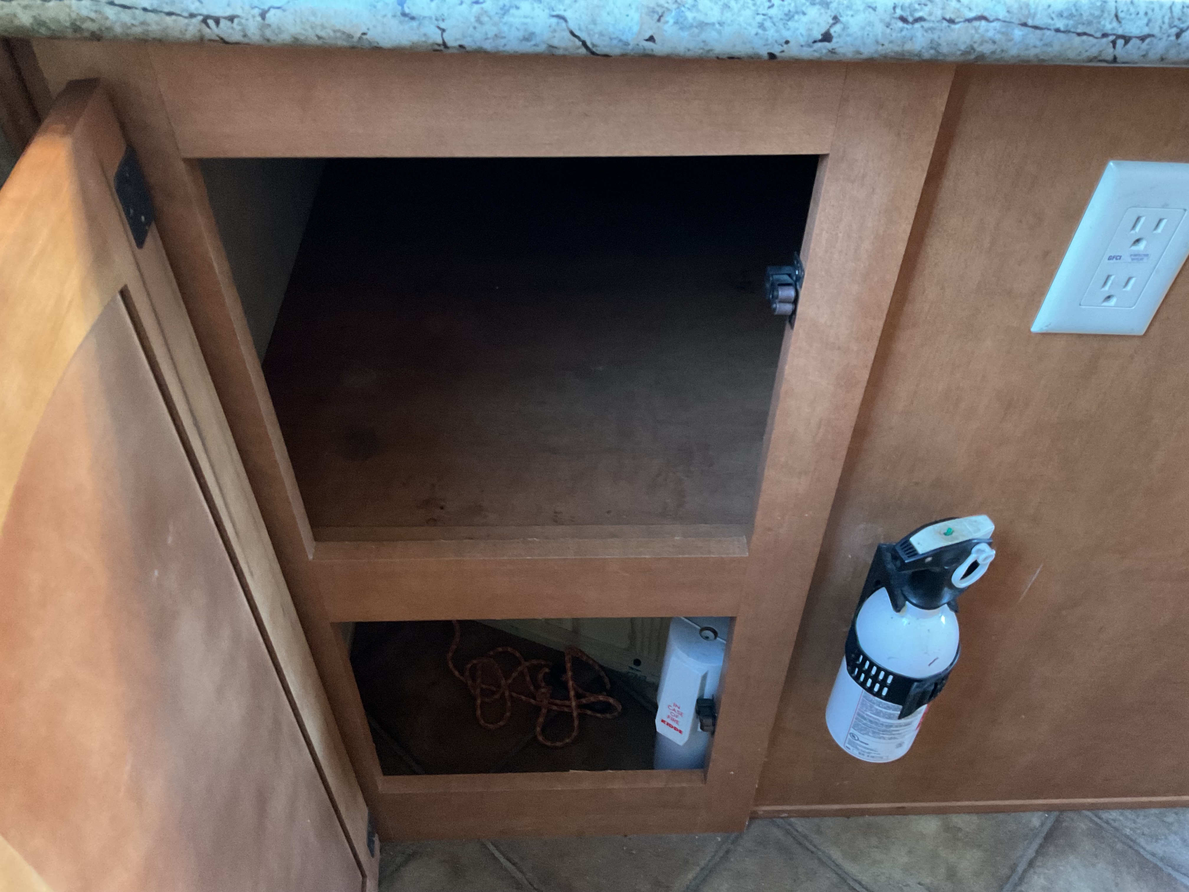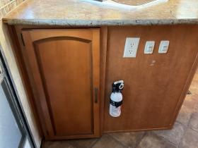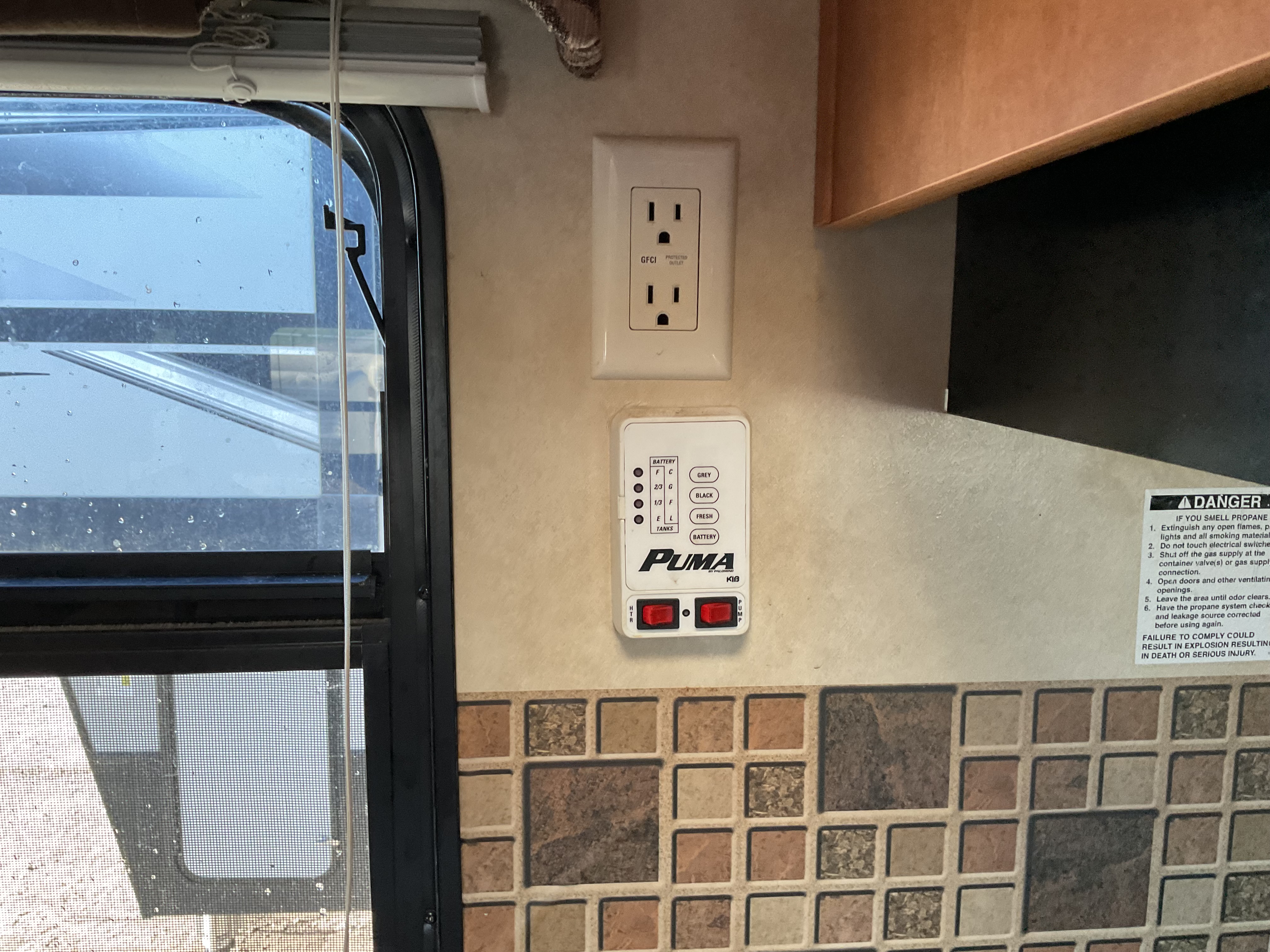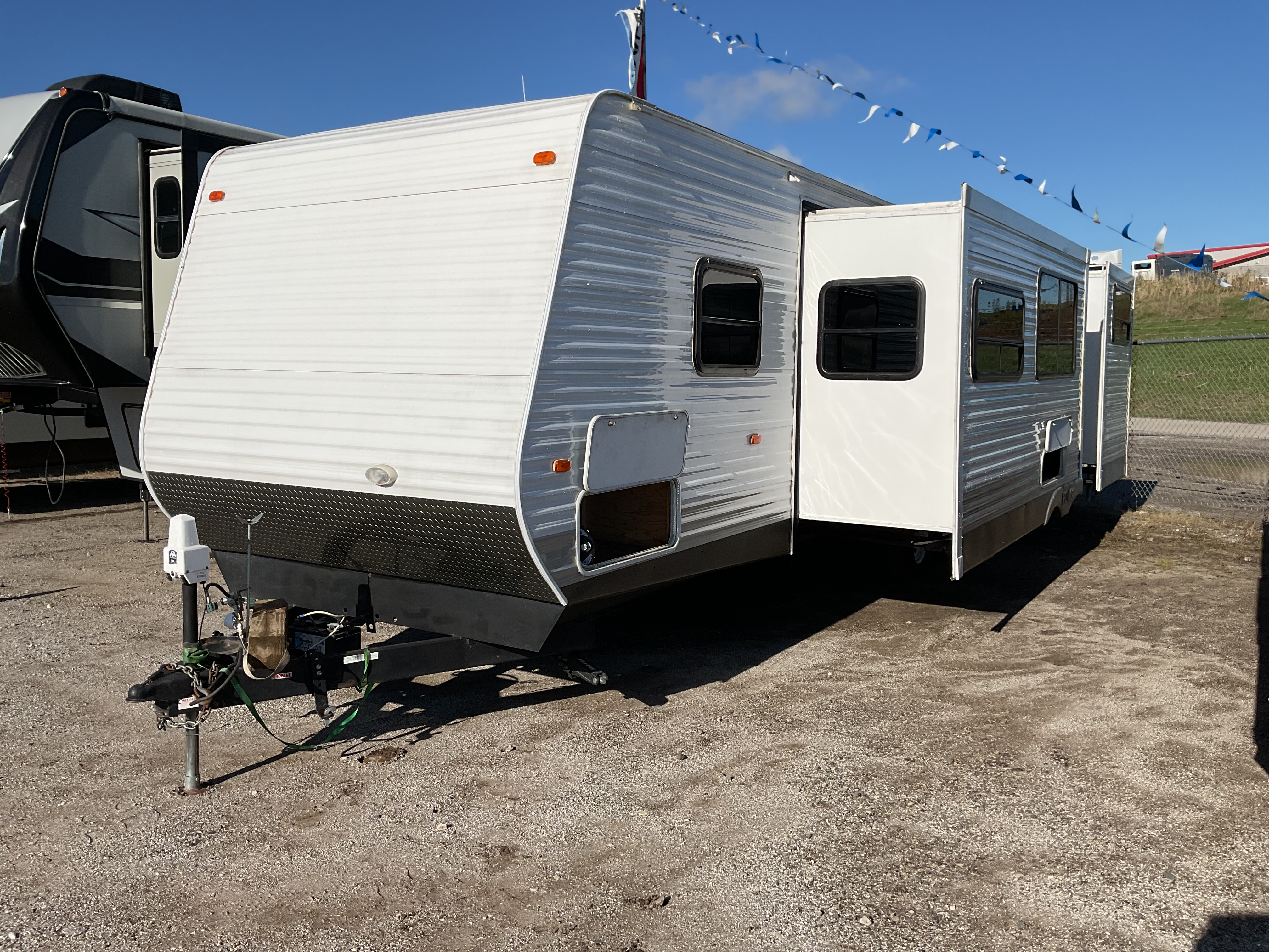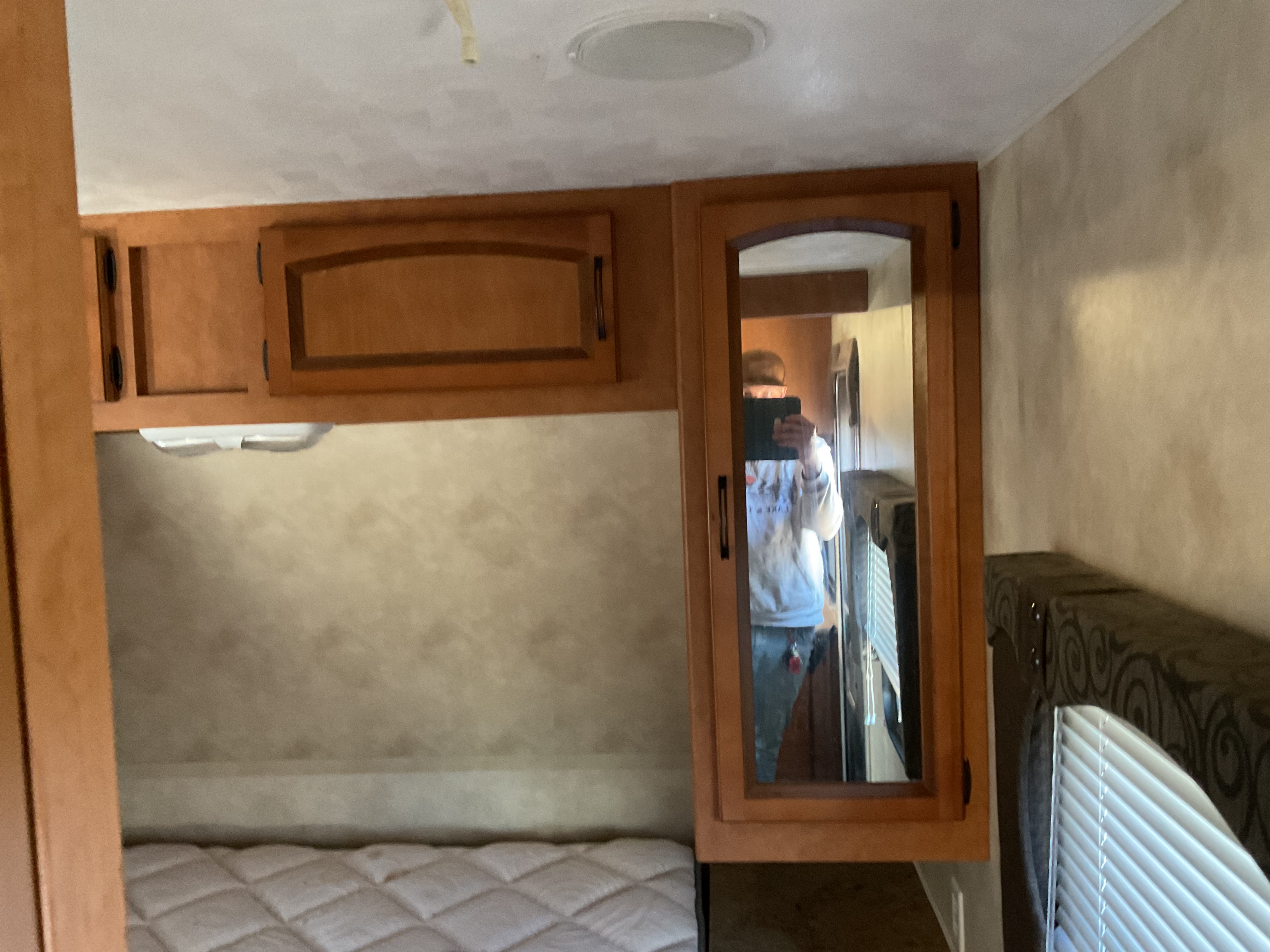 Missing propane tanks. Carpets and mattress is stained bad. Ceiling separated from skylight in main room. Floor in the bathroom is soft. Water damage by bottom left of the door.