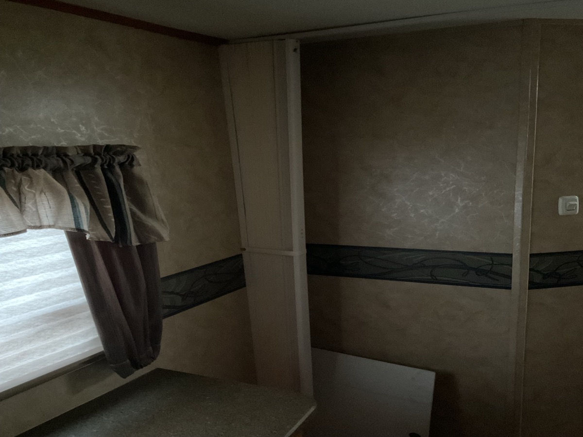 Cabinets and drawers kept clean, no bad smells. Kitchen tabletop is worn. Countertops are good. Carpets are stained. Has power, all lights working beside stovetop light. Appliance shop in good shape and operational. Shower glass pane missing/broken. Some