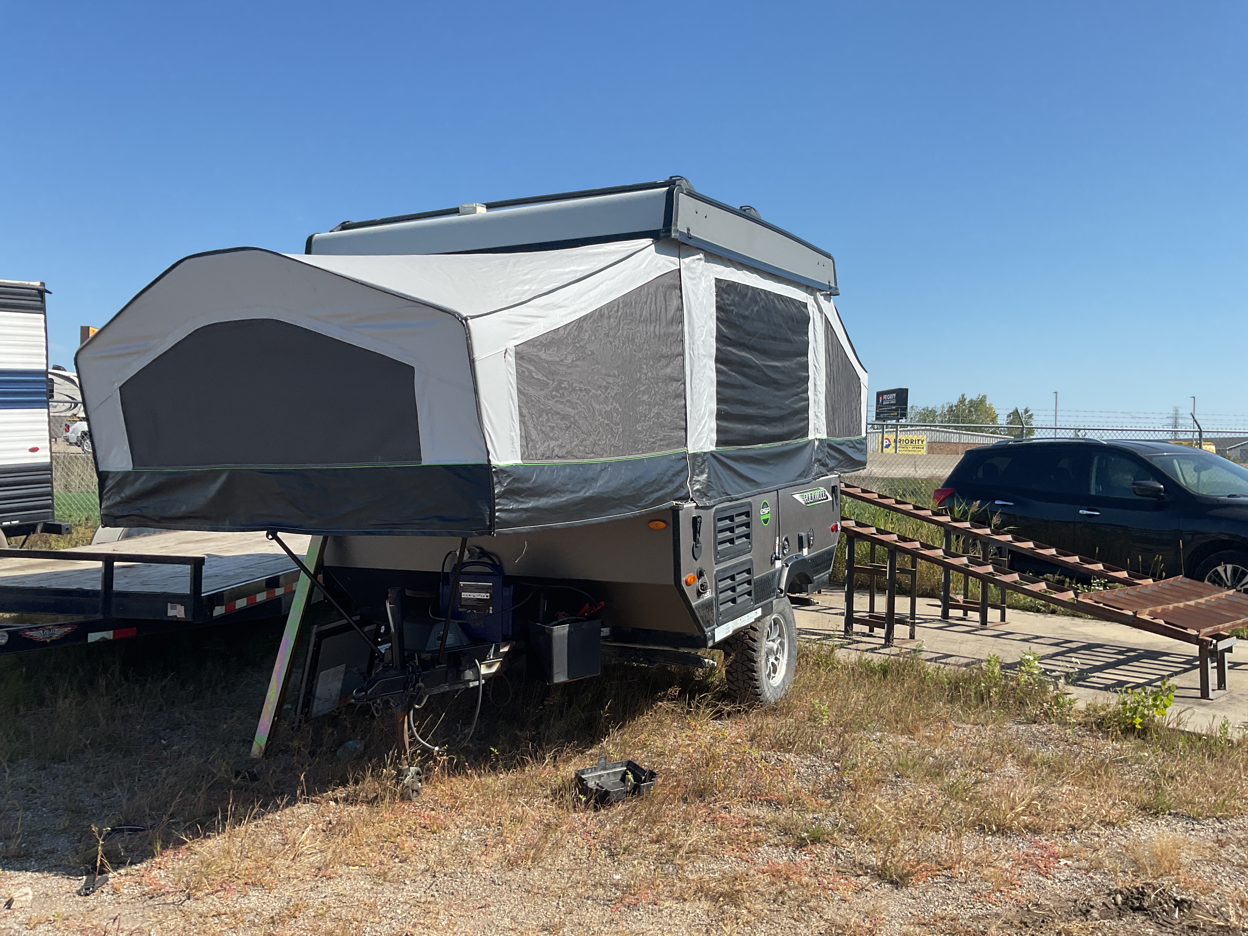 Power cable on battery is broken. Missing propane tank.